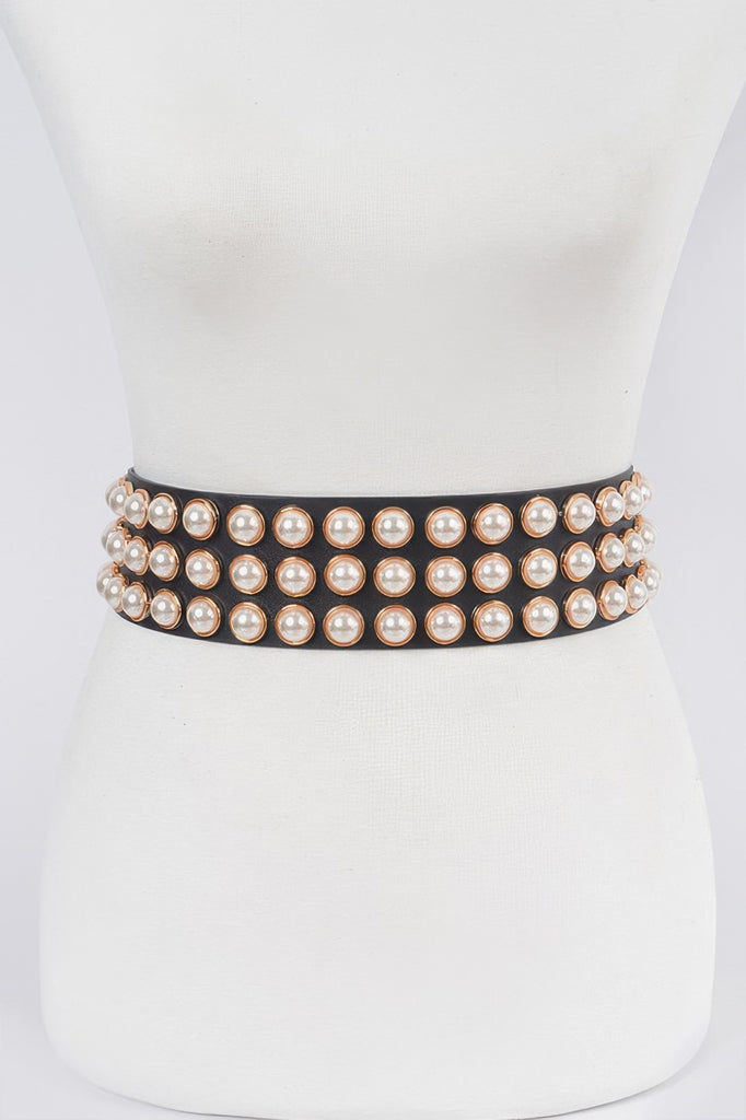 The Full Pearl Studded Waist Belt offers a polished, feminine finish with its glossy pearl detailing. Made from PVC and PU, it delivers structure with a soft sheen that pairs beautifully with dresses, skirts, or tailored looks.