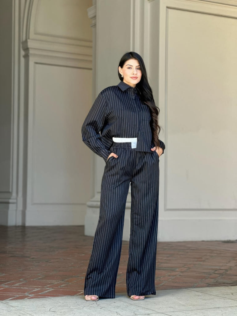 Sophisticated yet relaxed, this striped set with double waistband pants and top offers the perfect balance of structure and comfort. The collared button-down shirt features adjustable sleeves for versatile styling, while the contrast double elastic waistband pants ensure a flattering and flexible fit. Designed with a sleek straight leg silhouette, this coordinated set delivers effortless polish whether worn together or styled separately. Ideal for workdays, brunches, or travel-ready looks that keep you chic and comfortable.