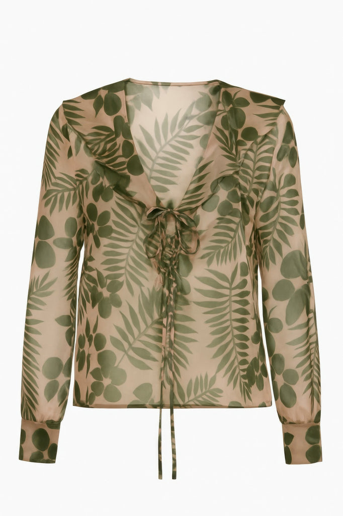 Light and effortlessly elegant, this leaf-printed sheer blouse brings a fresh, feminine touch to your wardrobe. Crafted from a semi-sheer fabric with a delicate drape, it features long sleeves and soft ruffle accents that enhance its romantic appeal. The front string tie adds a subtle boho detail, while the lightweight feel keeps it comfortable and airy. Designed without stretch, it maintains a fluid, relaxed fit that moves beautifully. Ideal for pairing with jeans, skirts, or tailored pants, this blouse transitions seamlessly from day to evening.