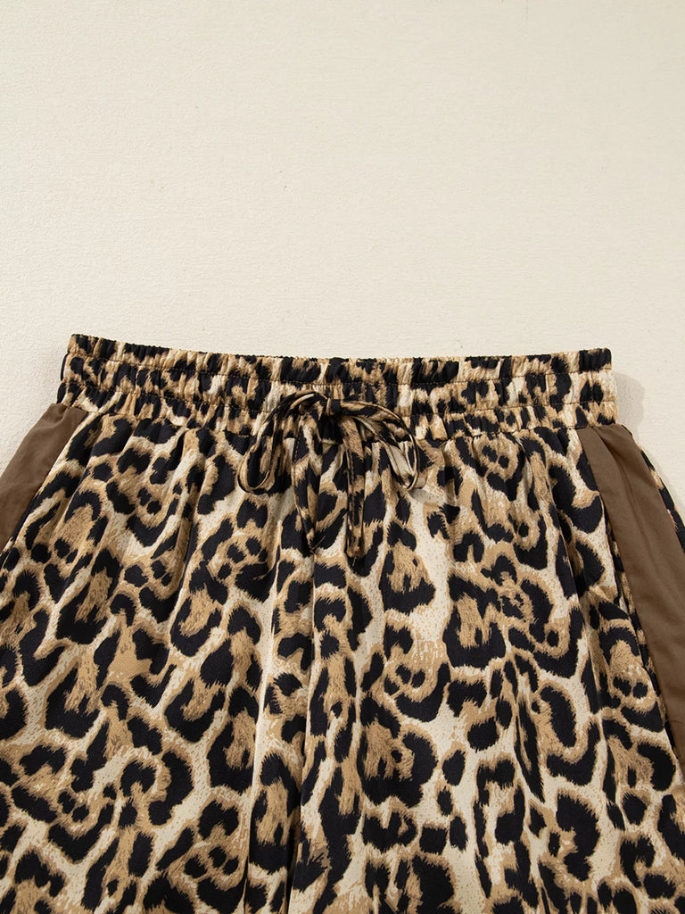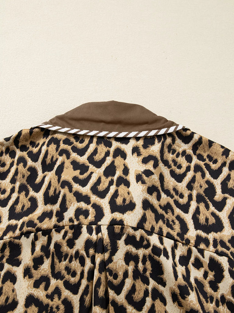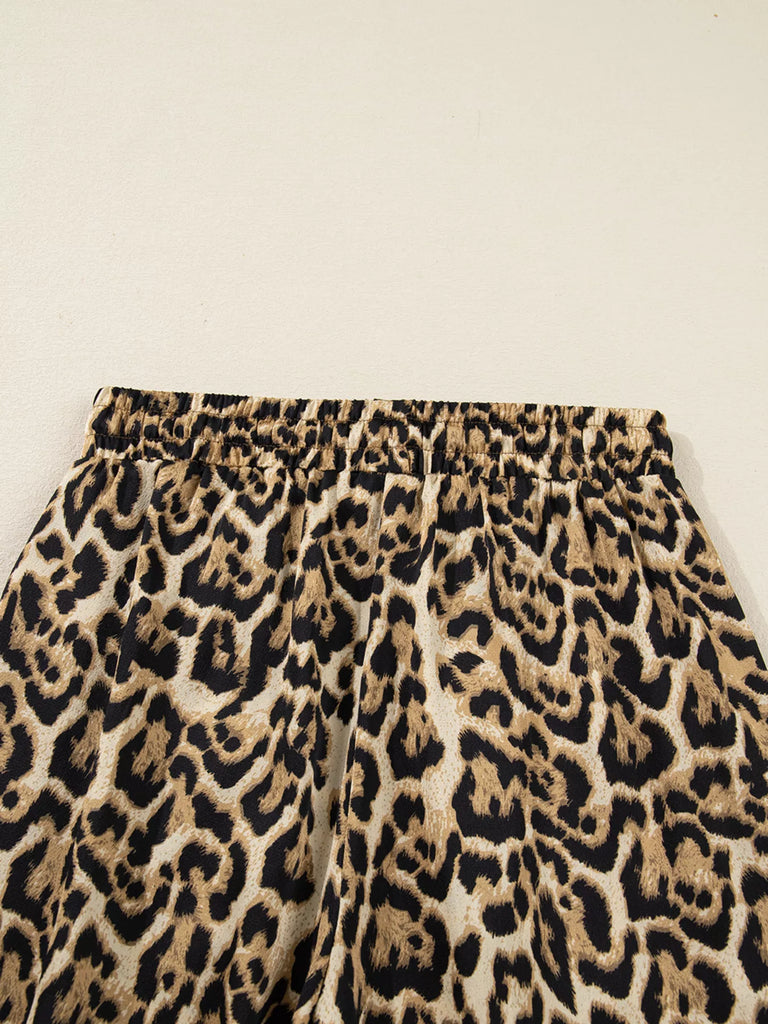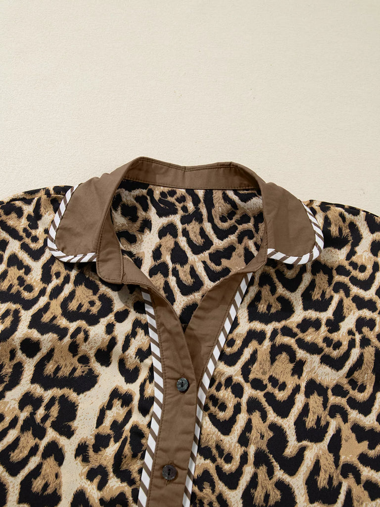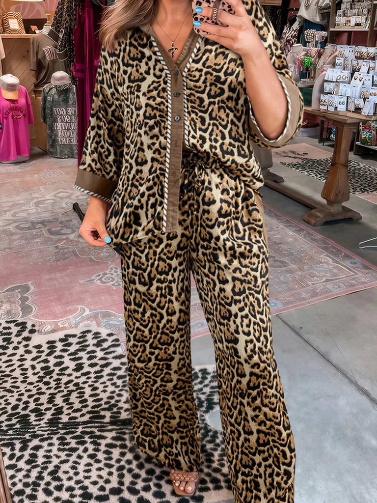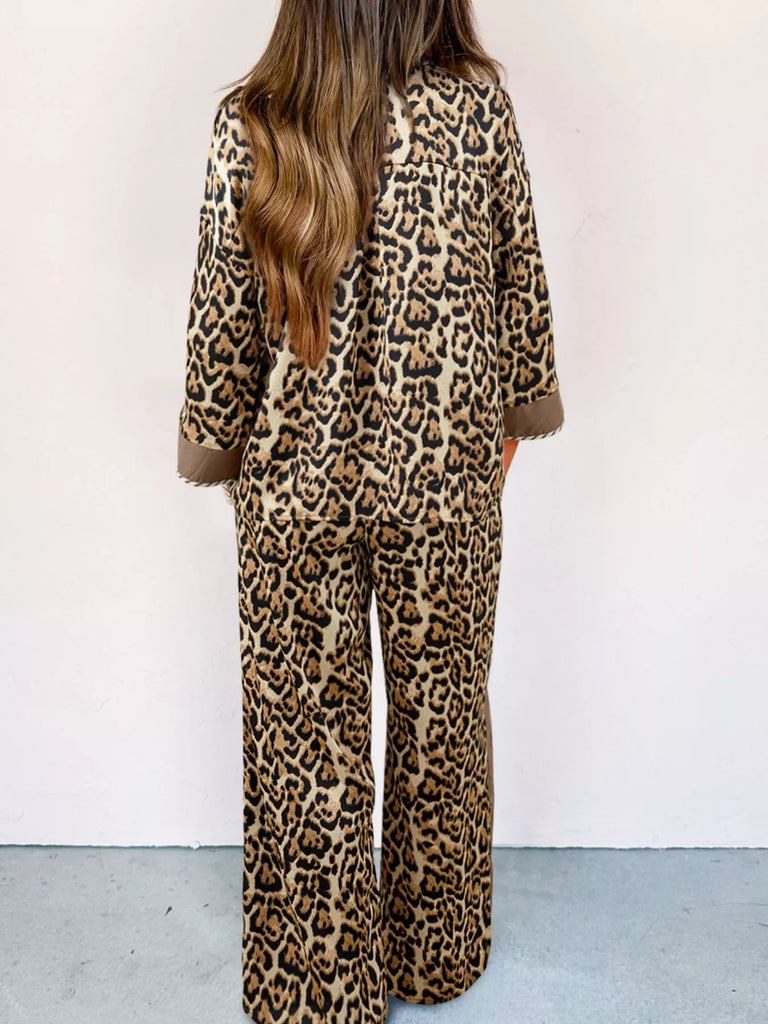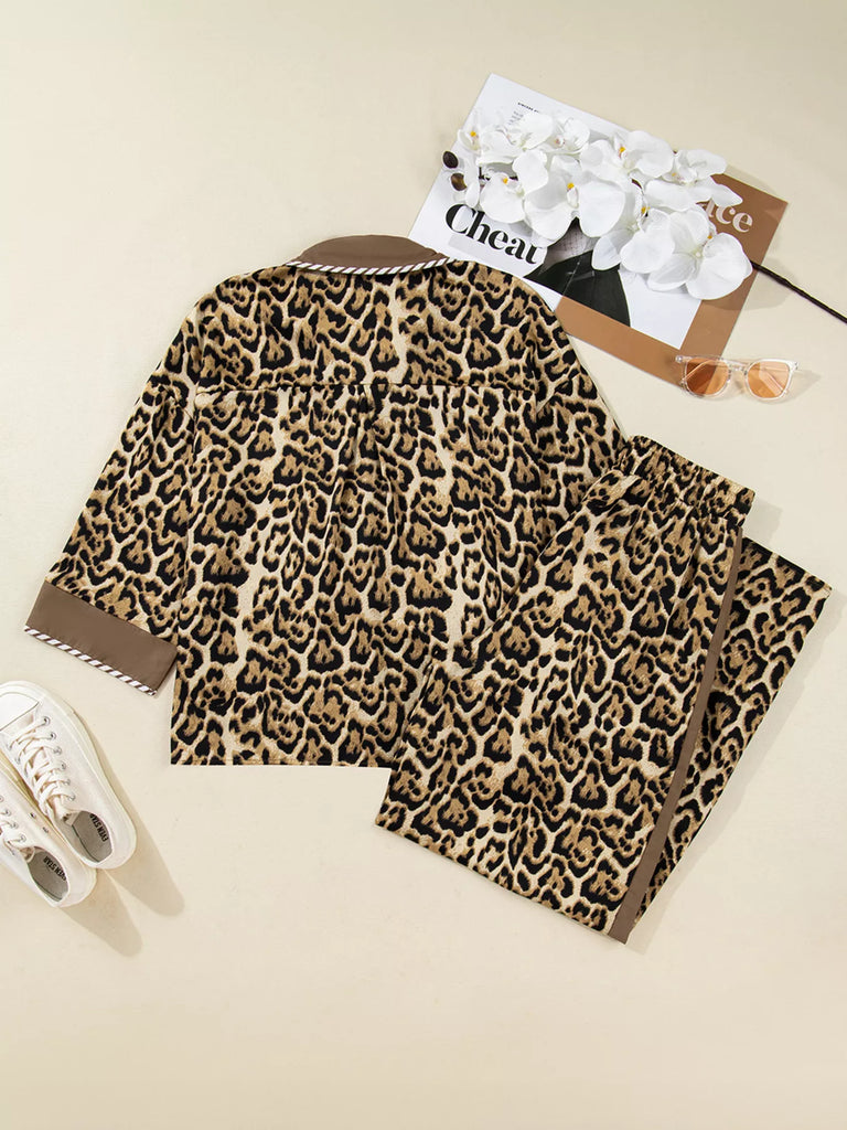 Leopard Collared 3/4 Sleeve Shirt and Loose Pants Two Piece Outfit Set
