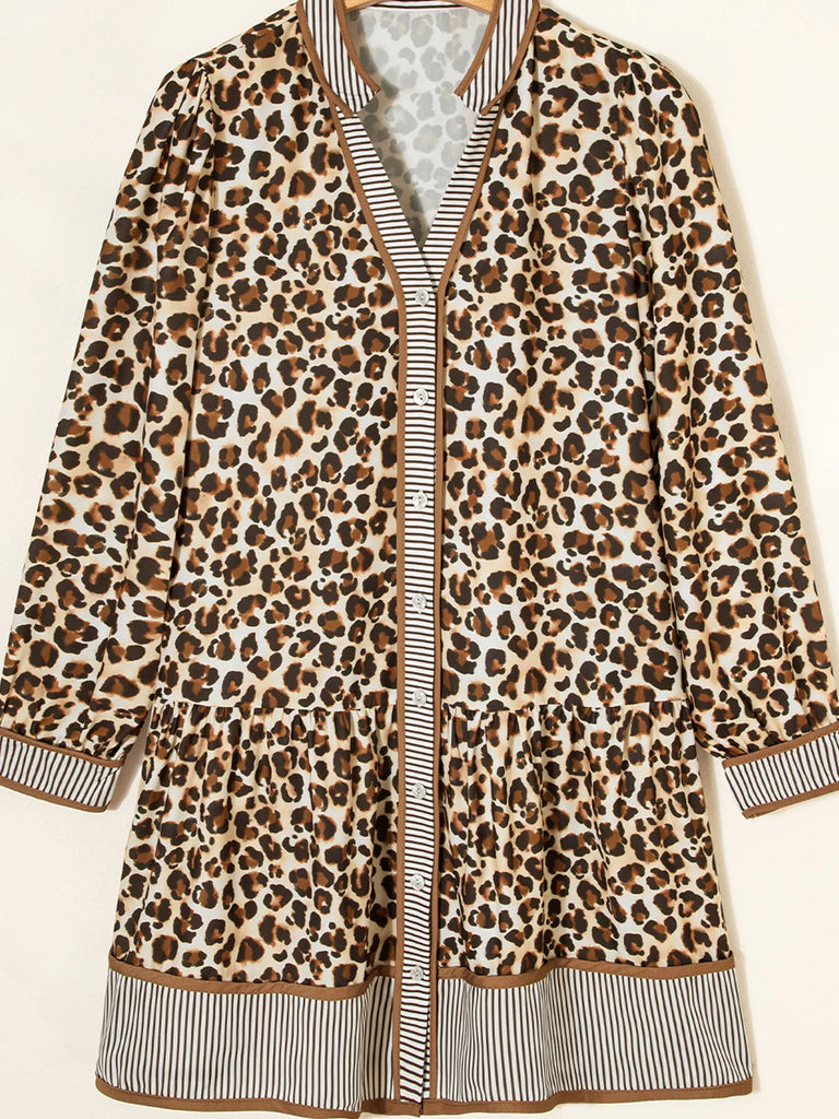 Leopard Print Striped Patchwork 3/4 Sleeve Loose Mini Dress