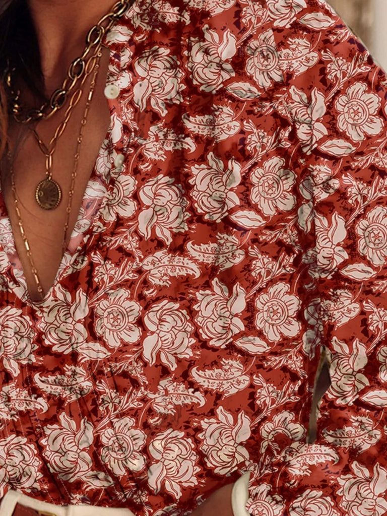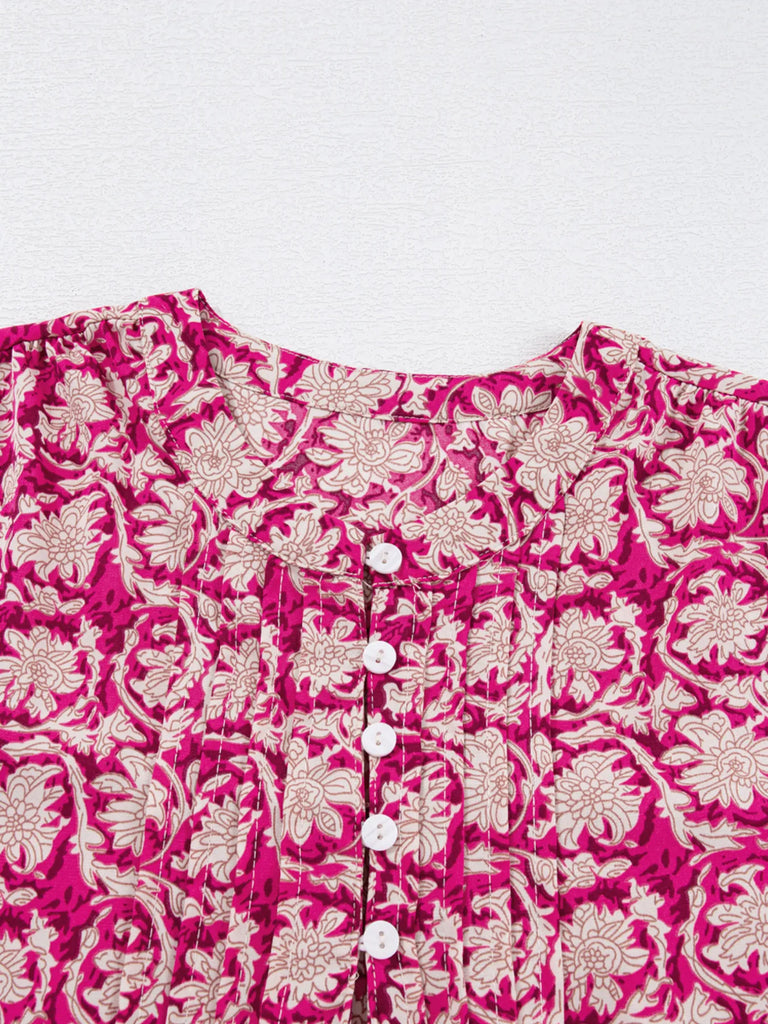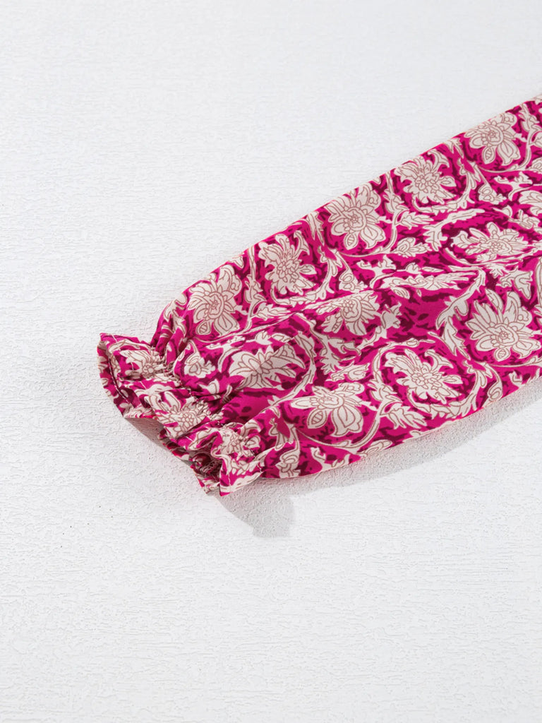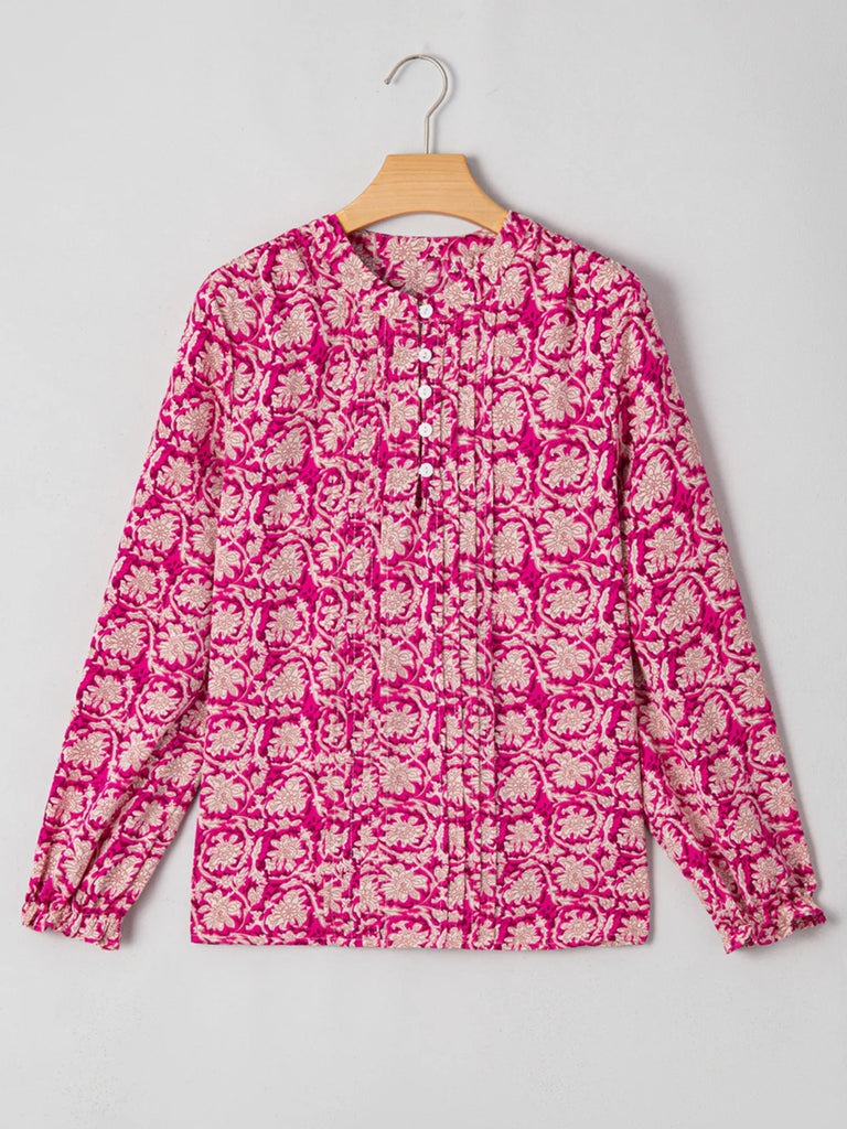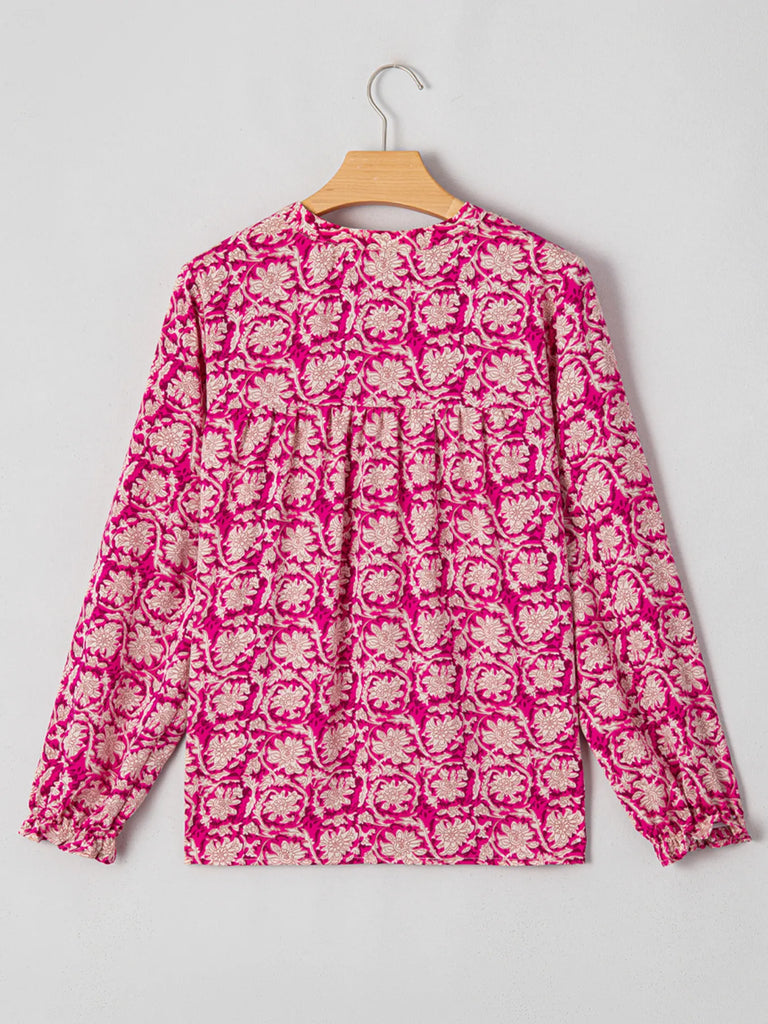 Floral Print Split Neck Pleated Long Sleeve Blouse
