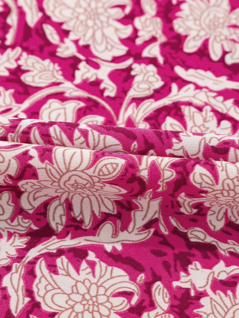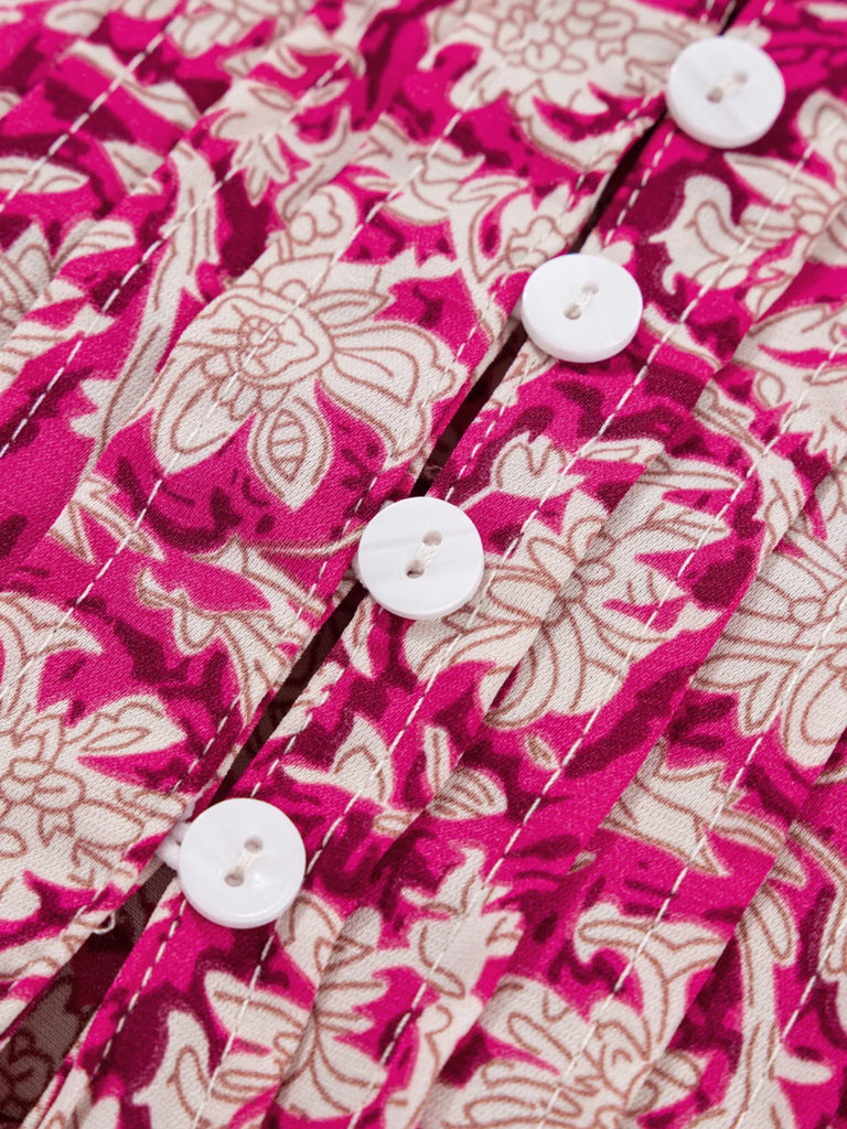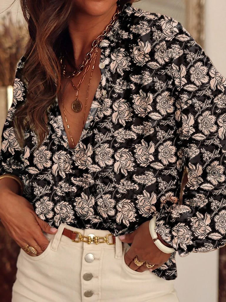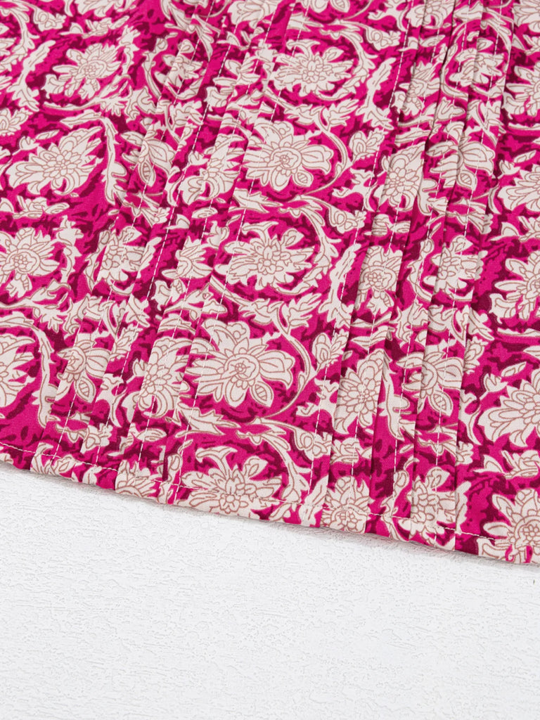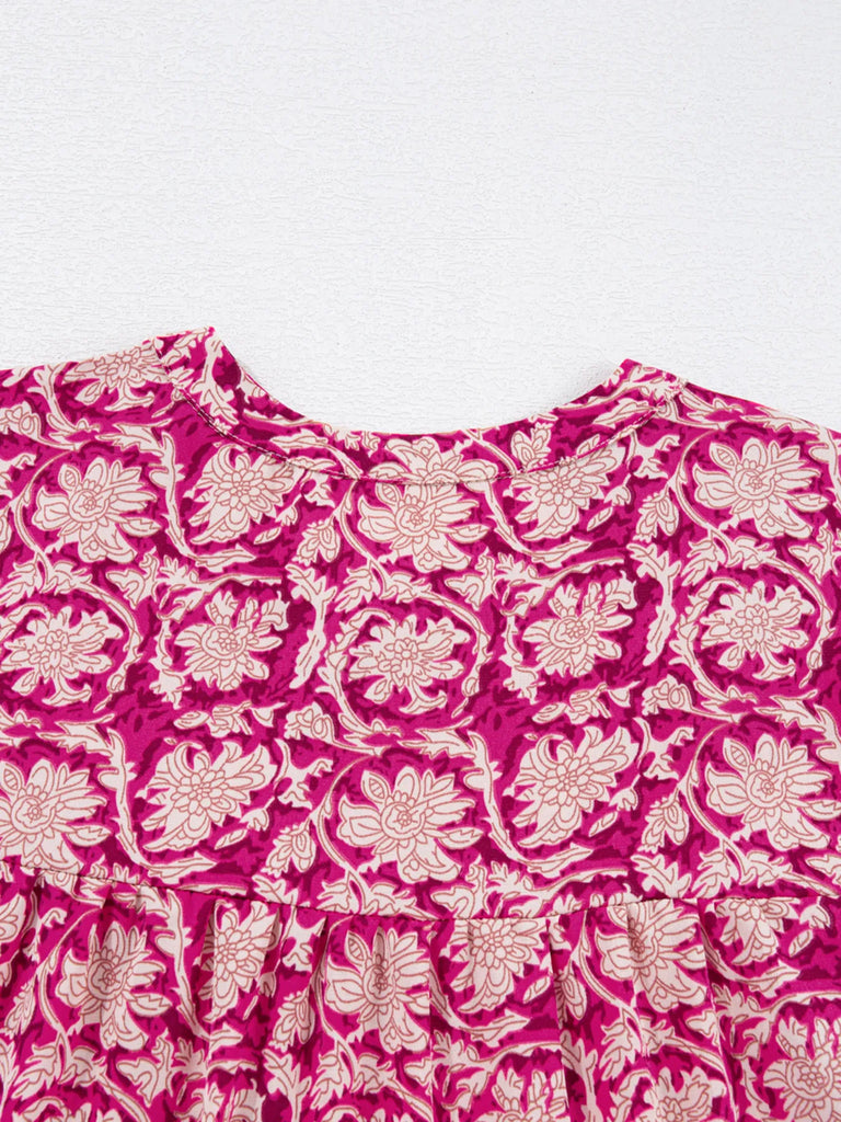 Floral Print Split Neck Pleated Long Sleeve Blouse
