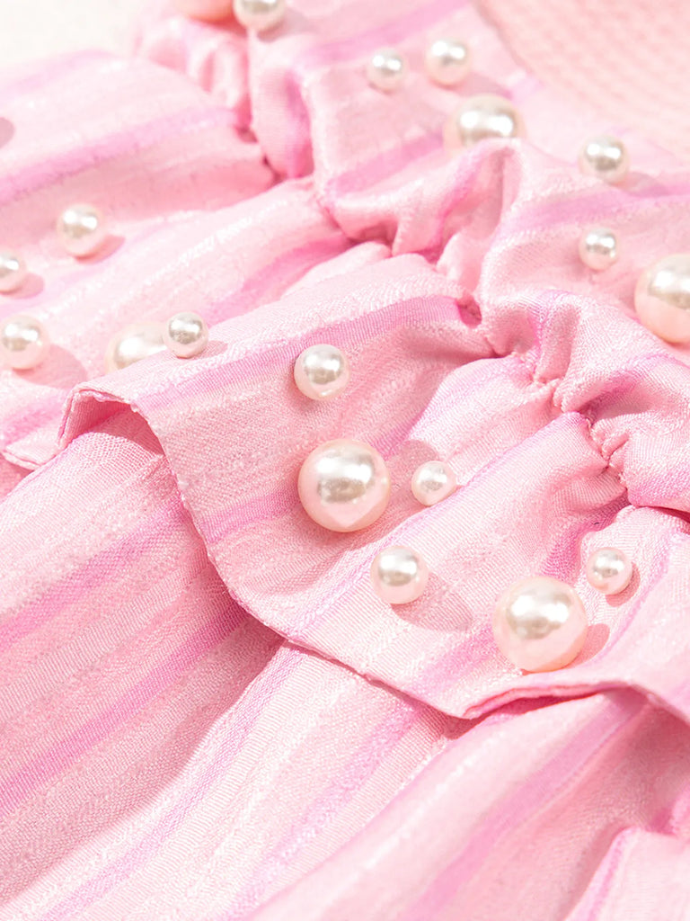 Make a bold statement with this Pearl Embellished Ruffle Sleeve Blouse, where soft blush-pink meets fearless fashion. The crew neckline frames your face while oversized ruffled sleeves command attention, each gather adorned with delicate pearls that catch the light with every movement. Crafted from a luxurious blend of 75% polyester, 20% viscose, and 5% elastane, this blouse offers subtle stretch for unrestricted movement and all-day comfort. The slightly stretchy fabric drapes beautifully, creating dimension and texture that elevates any ensemble. Style it with crisp white high-waisted pants for a striking contrast, or pair with tailored trousers for an unexpectedly daring office look. Easy care: machine wash cold and tumble dry low. Imported.