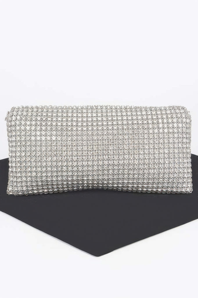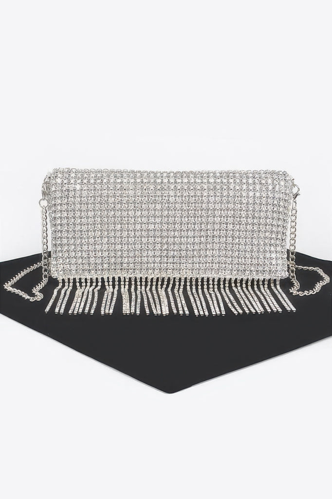 Make a statement with the Rhinestone Fringe Clutch — a dazzling evening bag designed to stand out. Measuring 8.75W x 4H x 1D, this slim clutch is adorned with cascading rhinestone fringe that shimmers with every move. Its compact silhouette makes it easy to carry, while the metallic finish and detailed fringe deliver full glam impact. A must-have for special occasions, it adds instant luxury to any evening ensemble.